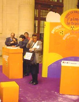 Ja dwars door deze miljoenenstad rijdt ongeveer eens in de 4 a 6 weken een trein met o.a. hoogradioactief afval van de kerncentrale in Blayais naar de opwerkingsfabriek in Marcoule, waar we vorige week voor de poort stonden. De plaatselijke groep protesteert hier regelmatig tegen en heeft eenmaal zo´n transport voor een halfuur geblokkeerd. In de namiddag gingen we naar het centraal gelegen station St. Jean, waar de castortrein enige tijd stopt gedurende een transport. Het franse spoorbedrijf SNCF had toevallig deze week een hoek ingericht voor PR onder het motto J´aime le train. Nog los van de atoomstroom waarop de SNCF rijdt, is dat met deze achtergrond natuurlijk een wat eenzijdig positief beeld. Tijd om ook de andere kant van de medaille te belichten.