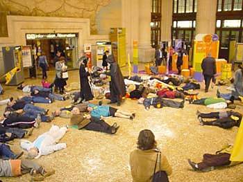 Na enige tijd ging een sirene en volgde een die-in. Aan de voorkant van het station zorgde de theaterstratus voor muzikale ondersteuning. Vanuit de reizigers was veel interesse in de folders en de reacties in het algemeen positief. De gendarmerie hield zich afzijdig.