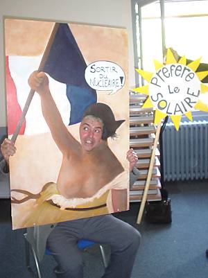 We hebben de loco als "Marianne pour Sortir du nucleaire" laten poseren. Mocht hij later gaan kruipen voor het behoud van een coalitie, kunnen ze z´n geheugen nog eens opfrissen.