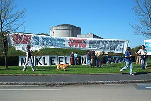 De demonstratie voor de poort verliep rustig. Het is Hemelvaartsdag en het grootste deel van de werknemers heeft een vrije dag. Dat heeft voor en nadelen. Nadeel is dat er nauwelijks mogelijkheid is om het personeel met ons protest te bereiken. Voordeel is dat er nu geen spanningen met dat personeel ontstaan; Twee jaar geleden moesten antikernenergie-activisten hier in bescherming genomen worden door de gendarmerie tegen de agressie van het personeel, dat zich door het protest in z´n broodwinning bedreigd voelde.