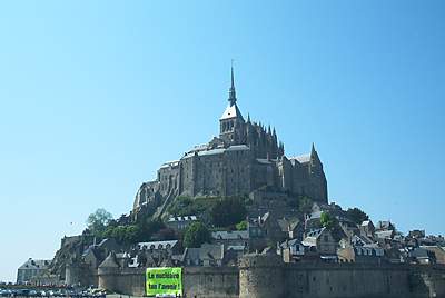Daarna gingen we door naar Mont St. Michèl op de grens van Bretagne en Normandie. Het stadje met klooster op een rots voor de kust is een van de toeristische topattracties in Frankrijk. Met de slogan "En Normandie, Le Mont Oui, un EPR Non" was hier een manifestatie. Het grote spandoek "Le nucléaire tue l´avenir" werd aan de muur die rond dit stadje staat uitgehangen. Er was even wat gedoe met de gendarmerie, maar uiteindelijk gaf de burgemeester van het eiland toestemming.