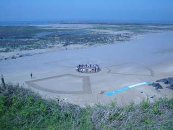 Daarna ging de tocht naar Flamanville. De kerncentrale hier,aan zee, is na Penly de meest waarschijnlijke locatie voor de nieuwe EPR reactor. De huidige centrale ligt onzichtbaar voor het publiek weggestopt in een vallei in de rotskust. Op het strand in de buurt was door plaatselijke Greenpeace France leden een groot radioactief teken aangebracht en opgevuld met kiezels en schelpen om het (deels toeristische) publiek te wijzen op de nucleaire vervuiling van deze centrale en het even verderop gelegen La Hague.