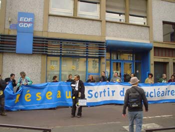 Onderweg werd bij het regiokantoor van de EDF gestopt voor toespraken en om het pand vol te plakken met stickers. ("certifié pro-nucléaire")