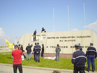 Zij hielden zich grotendeels afzijdig en regelden en controleerden voornamelijk het verkeer. Even ontstond er wat commotie toen een magere Hein het betonnen toegangsbord van de centrale beklom. De gendarmerie wilde dat niet, ´voor de eigen veiligheid van de persoon´ was het verhaal, maar het was niet zo´n mooi plaatje voor de EDF leek meer de reden. Een gendarme klom ook omhoog, maar door de aandacht van het publiek en (eigen) media zag hij er al snel vanaf verder iets te doen. Door de demonstratie ontstond al snel een kleine file van in- en uitrijdend werkverkeer, waardoor het flyers uitdelen aan het personeel gemakkelijk ging.