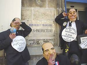 We hebben de loco als "Marianne pour Sortir du nucleaire" laten poseren. Mocht hij later gaan kruipen voor het behoud van een coalitie, kunnen ze z´n geheugen nog eens opfrissen.