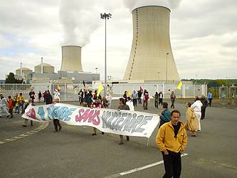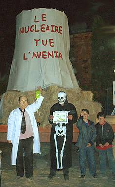Ook waren er in het verleden terreinbezettingen en is een van de koeltorens tweemaal door activisten beklommen om spandoeken uit te hangen. De laatste jaren is door gebrek aan resultaten de teleurstelling toegenomen en het verzet verminderd. Een kleine groep zet de strijd echter nog steeds voort en volgt de centrale op de voet, o.a. door het doen van eigen metingen naar radioactieve vervuiling. Een van de doelen van de Tour is ook het steunen en hopelijk versterken van plaatselijke groepen. Daarover was de plaatselijke groep positief en ook over de opkomst bij deze demonstratie voor de poort. Het gebruikelijke programma van sprekers, muziek, straattheater vanuit de Tour. Een heel sterk beeld werd door de plaatselijke groep neergezet door een baby te laten rondkruipen binnen een cirkel van 58 blikken kernafval met daarop de namen van de 58 franse kerncentrales (zolang het de baby beviel natuurlijk, met pa in de buurt) De 58 blikken werden even later door een aantal peuters omver gegooid en de baby zodoende "bevrijdt".
