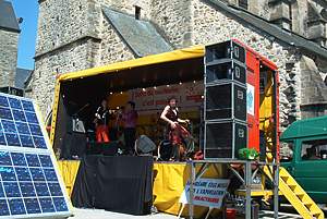 De Theaterstraat bus, als rijdend spandoek met de tekstborden" le nucleaire tue l´avenir" (kernenergie doodt de toekomst) en "nucleaire non renouvelable oui" (kernenergie nee duurzaam ja) en de afgelopen weken volgeplakt met tal van posters en teksten, sloot de stoet.